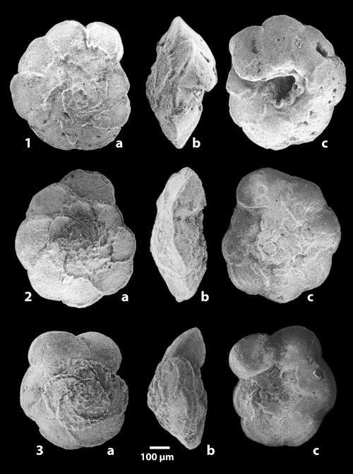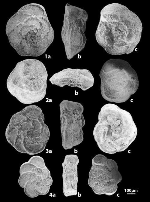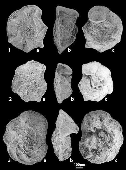 Planche 1 : Foraminifères planctoniques de la Formation Abiod à Ellès (a : face spirale ; b : profil ; c : face ombilicale).