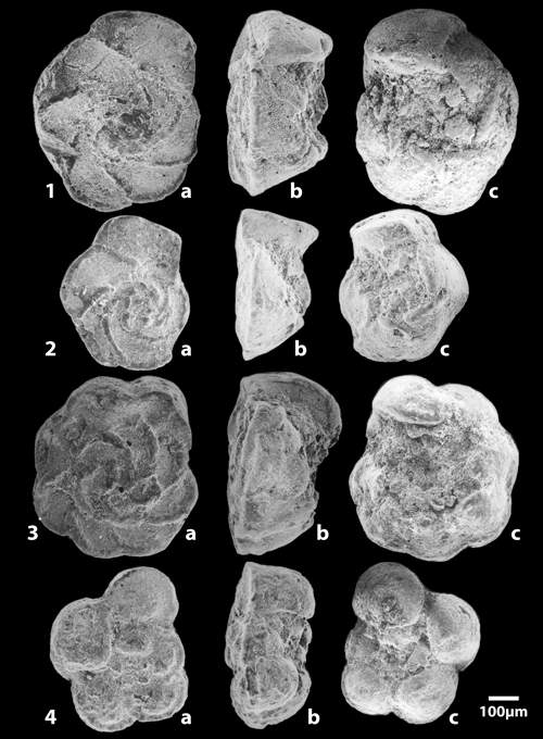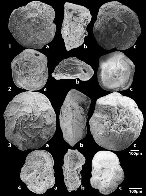 Plate 4: Planktonic foraminifers of the Abiod Formation at Ellès (a: spiral side, b: lateral view, c: umbilical side).