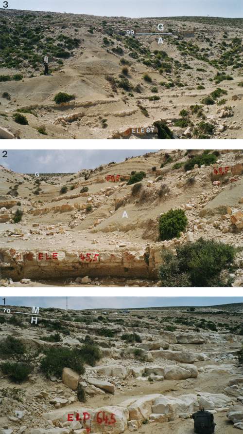 These are the first limestone beds visible at the downstream end of wadi Ed Dam, above the Kef marls. Stratigraphic continuity is not assured visually between the three partial sections ELA, ELB and ELC. However, as the dip is very low, it may be assumed (if the existence of important faulting is excluded because the limestones are not fractured more than is normal and the succession is not incoherent) that the interruptions in visibility do not represent more than a few meters. The limestones grayish-white, well-indurated with a conchoidal fracture are interbedded with marly limestones, their thicknesses measured in decimeters.
