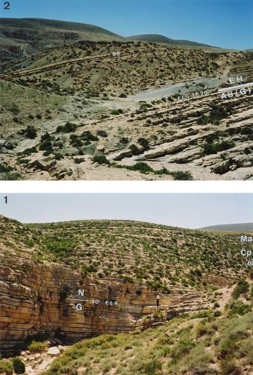 figure 2 (negative 275-18). The boundary between the Abiod Formation (AB) and the El Haria Formation (EH) in partial section ELG (upper part of wadi El Kerma); middle portion of the Maastrichtian.