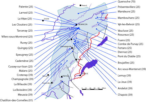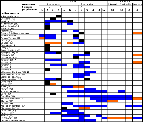Peuplement Scarbu(2) : ce peuplement a été reconnu dans 14 coupes. Il semble absent au Sud de l'accident de Salins, région marquée par une lacune de sédimentation à la base de l'Oxfordien inférieur (voir , 1966).