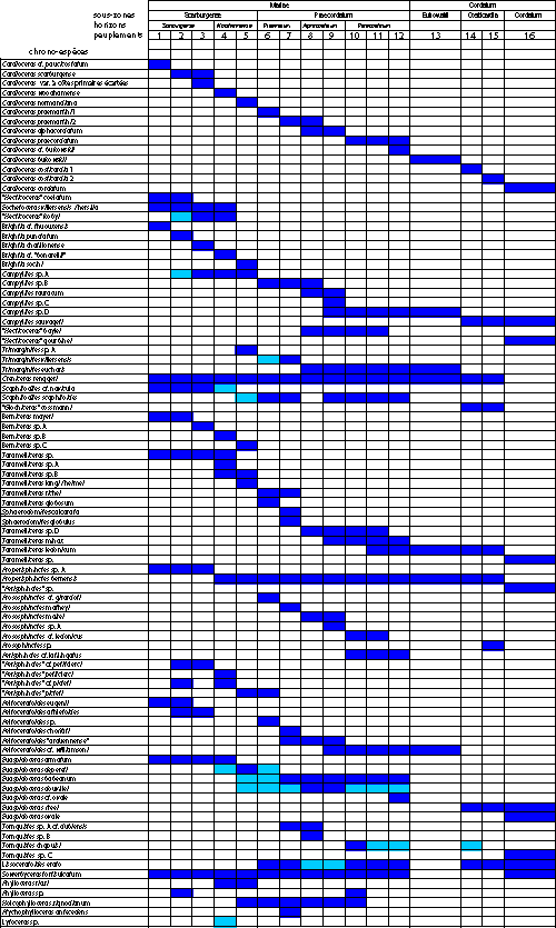 Marqueurs spécifiques : sont signalées les espèces qui caractérisent avec certitude chaque unité biostratigraphique définie.