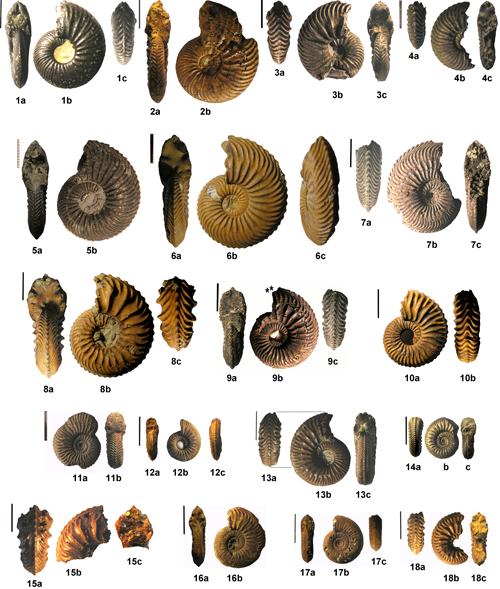 Woodham(6), Boujailles ; 7a-c Cardioceras alphacordatum (), peuplement Alpha(8), Andelot BN2 ; 8a-c Cardioceras alphacordatum () variété à côtes primaires très espacées et saillantes, peuplement Alpha(9), Villers-sous-Montrond NE0 ; 9a-c Cardioceras praecordatum (), forme typique, peuplement