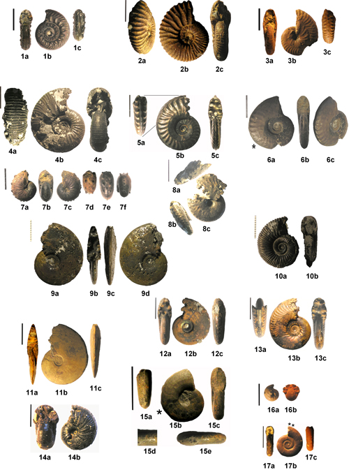 Costi(15), Pont du Diable ; 16a-b Tornquistes sp., peuplement Cord(16), Andelot ; 17a-c Euaspidoceras ovale (), peuplement
