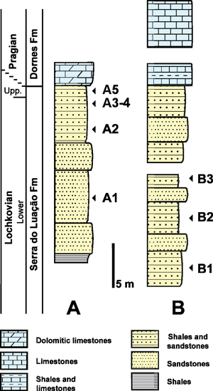 Figure 3: Diagrammatic lithology of the Dornes spit (A) and Dornes - Vale Serrão road (B) sections in the vicinity of the Lochkovian-Pragian boundary and the sites of the localities sampled.