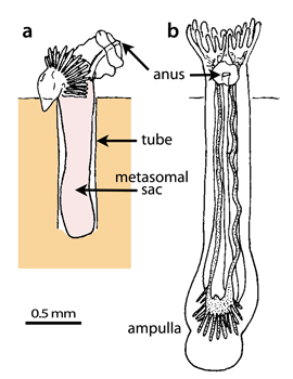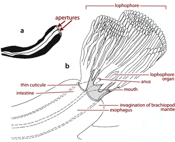 Figure 1: a. Longitudinal thin section of Diorygma atrypophilia with the two apertures of the limbs (modified, after , 1961). b. Stylised reconstruction of the phoronid showing its general morphology and inferred life attitude (after & , 1970).