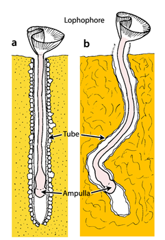 Figure 4: Position of the Phoronida in the substrata: (a) embedded vertically in soft sediment; (b) burrowing in hard substrate (modified, after , 1982).