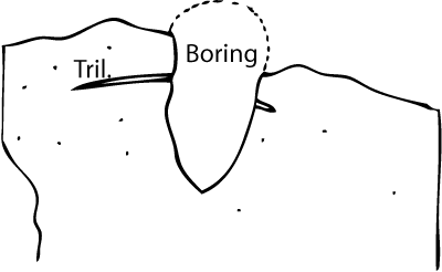 That the large conical, slightly amphora-shaped traces in the Lower Ordovician glauconitic packstone are borings is supported by the observation that they sometimes cut large bioclasts (Megistaspis trilobites). The large Megistaspis skeletons are relatively massive. The traces were bored into a lithified sea-floor - hardground. If the rock had not been lithified (a lime mud) prior to their excavation, the Megistaspis bioclasts would have been pushed aside by the digging organism and not cut through. We agree with et alii (2004) that the cutting of a trilobite bioclast by Gastrochaenolites (Lower Ordovician) is direct evidence that this trace fossil is a true boring.