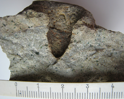 Figure 2: A plug-shaped vertical boring (filling sediment removed) cutting a trilobite pygidium (Megistaspis) in a hardground from Saka, at the upper surface of the Päite Member, marking the boundary between the Floian and Dapingian stages. The figured specimen is deposited in the Geological Museum, Museum of Natural History, University of Tartu (TUG): TUG 1405-1.