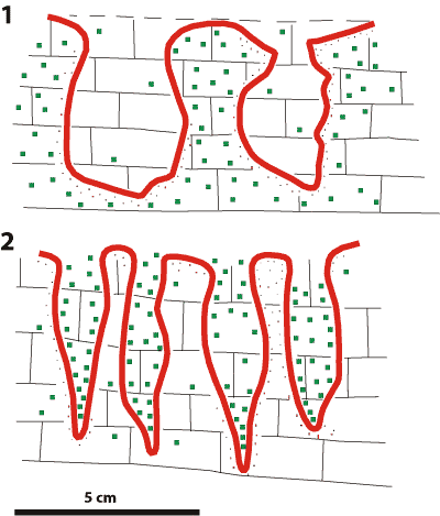 Figure 3: 1) Section of a possible hardground on the Väike-Pakri cliff with borings tentatively assigned to Gastrochaenolites oelandicus, cut into the upper surface of the Päite Member, the boundary between the Floian and Dapingian stages (after , 1961). 2) Section of a possible hardground with large plug-shaped probable borings, like those found in Saka: at the upper surface of the Päite Member, the boundary between the Floian and Dapingian stages (after , 1961). Hardground surface: brown; impregnation by glauconite: green.