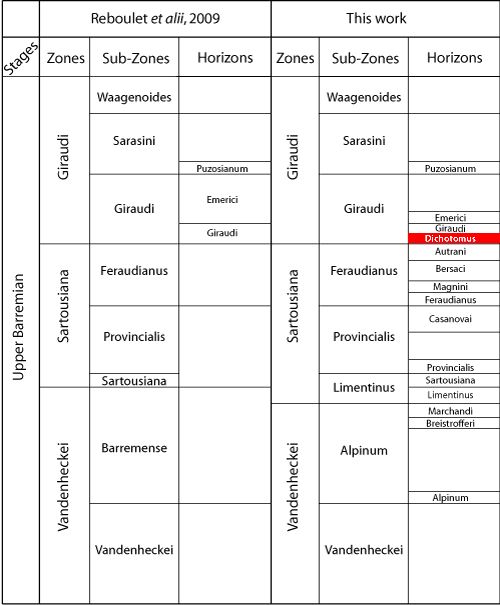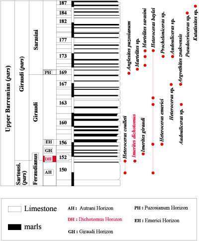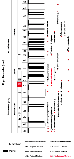 ) its appearance in the stratigraphic succession is in agreement with its biologic relationships. These facts, and the need for the establishment of a high resolution biostratigraphy for the whole of the Barremian ( et alii, 2006; et alii, 2007; et alii, 2008; et alii, 2009), has impelled us to propose Imerites dichotomus as a new biostratigraphic marker in the Vocontian Basin. This species occurs in strata immediately above the major beds of the Autrani Horizon at the top of the Feraudianus Subzone (Sartousiana Zone), and immediately precedes those of the Giraudi Horizon where Imerites giraudi () occurs