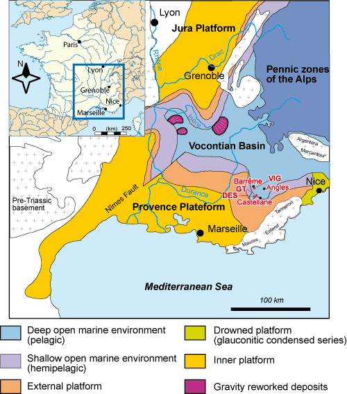 The Lower Cretaceous of southeastern France is marked by the evolution of a large intracratonic subsident area known as the Vocontian Basin (, 1900). The area of the historical Barremian stratotype