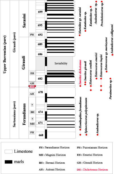), and its upper limit is currently set at the base of the Giraudi Horizon (bed No. 439 in the VIG section) with the first appearance of Imerites giraudi (). The Dichotomus Horizon is also present in the sections near La Baume (Castellane area): beds 151 to 152 in the Descouère section (DES,