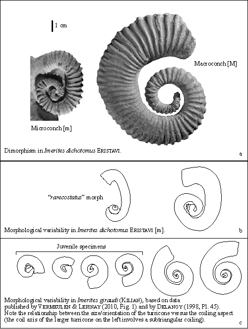 Fig. 10) for the Kutatissites. In Imerites, the phenomenon is the same: a larger turricone generally is accompanied by a less regular or triangular coiling before normal involution resumes. However, contrary to the views of & (2010) these purely mechanical constraints are not comparable with the dimorphic differentiation in Imerites dichotomus where tripartite adult microconch [m] are associated with large planospiral adult macroconch [M] (see et alii,