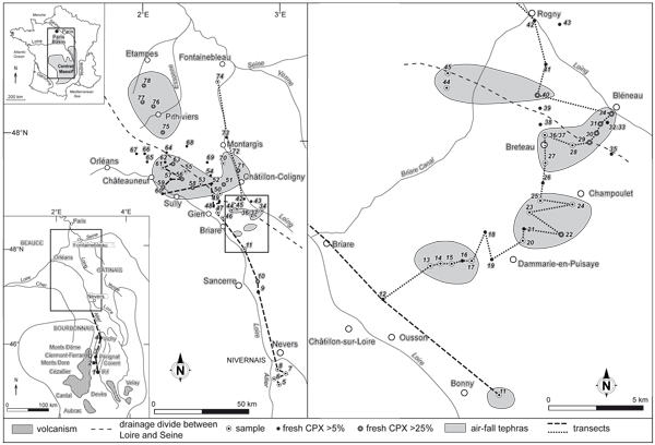 Volcanic clinopyroxenes (CPX) are common in the soils and alluvial and colluvial deposits of the Loire and Seine basins. In the Loire basin, they are abundant in all alluvial deposits, and numerous researchers (, 1969; , 1979, 2003; , 1987, 2005; & , 2001) have used them together with other volcanic minerals for stratigraphical and/or palaeogeographical purposes. In the Seine basin, CPX have been found in the highest terrace of the Seine ( & , 1995), in the lower terraces of the Seine and the Loing (, 1972; , 1972; et alii, 1978), in the sandy gravels in the bed of the Seine beneath post-glacial Holocene muds and in the marine sediments extending from the Seine estuary to the center of the English Channel ( et alii, 1972), and in soils of the Beauce region ( & , 1996). In the Seine basin, they have been explained in three ways.