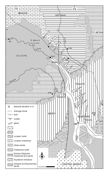 From a source at an altitude of 1406 m in the Southern Central Massif, the Loire River follows a northwards course up to the Sologne Basin where it turns before joining the Atlantic Ocean. The general geological setting is shown in Figs. 1