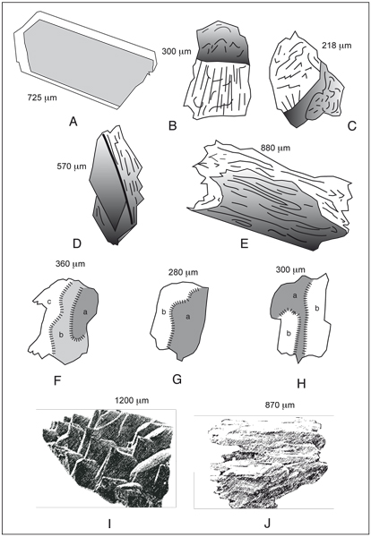 Different degrees of etching in clinopyroxene grains (the highest length is marked in µm). A: prismatic green Montdorian CPX; B, C: green and brown CPX with bevelled cracks; D: green CPX with stepped cracks; E: slight peripheral weathering; F, G, H: highly weathered brown CPX with stepped surfaces and curvilinear talus; I: scaly brown CPX (SEM photograph, from ,