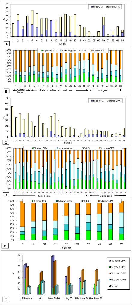 Figure 6: Graphs showing the distribution of CPX in space and in time. ILC: intermediate or light coloured CPX. A and B: in the Allier and Loire valleys (based on percentages of fresh and altered CPX, the sum of the two boxes is the CPX abundance (A), based on colour (B)); C and D: between the Loire and the Loing (based on percentages of fresh and altered CPX, the sum of the two boxes is the CPX abundance (C), based on colour (D)); E: CPX colour variation for the Allier-Loire F6 terrace, upstream to downstream; F: mean characteristics of the main regional units (Beauce loam, glacis deposits, F1-F0 Allier-Loire alluvial deposits, F0 Loing, F 4 and F6 Allier-Loire alluvial deposits).