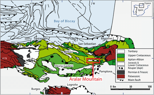 Figure 1: Location of the Aralar Mountain in the western part of the Basque-Cantabrian Basin in the northern margin of Iberia and south of the Bay of Biscay (modified after et alii, 2009).