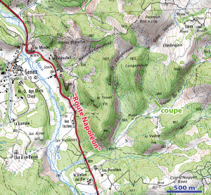 Localisation géographique des récoltes, le trait vert indique l'endroit de la coupe, les coordonnées des affleurements des niveaux 1 à 5 sont 06° 25' 56'' E et 43° 54' 29'' N.