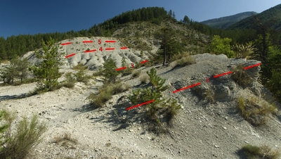 Figure 1.B : Marno-calcaires valanginiens de Senez-Lioux, niveaux de récolte 2 à 5. Le niveau 1 est situé en bas de la pente à droite, en bordure du ruisseau du Vallon du Pin.