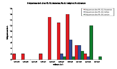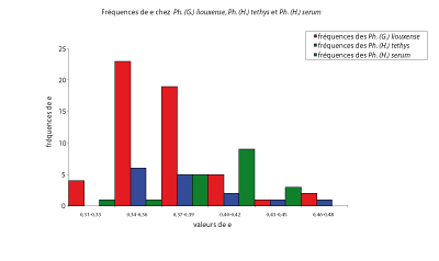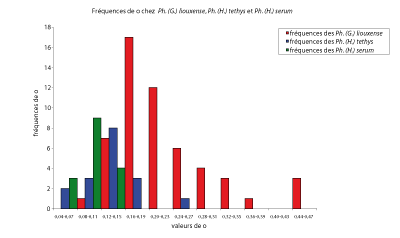 Figure 82 : Histogrammes des fréquences de o chez les espèces Ph. (G.) liouxense, Ph. (H.) tethys et Ph. (H.) serum.