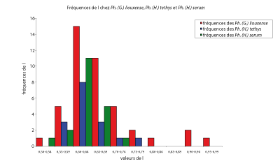 Figure 83 : Histogrammes des fréquences de l chez les espèces Ph. (G.) liouxense, Ph. (H.) tethys et Ph. (H.) serum.