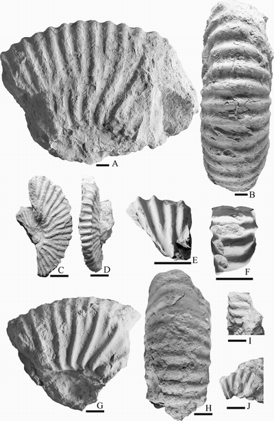 figs. E-G). Hypacanthoplites sp. 1 possède des cotes flexueuses et ce fragment de grand Hypacanthoplites date de l'Aptien supérieur. Hypacanthoplites cf. milletianus est un taxon de l'Albien inférieur ; Epanisoceras sp. peut être présent dans l'Aptien supérieur et dans l'Albien.