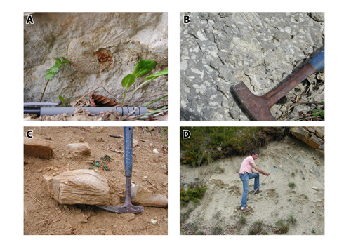 Figure 2: A: cherts in calcarenites of the interval 227.1 to 228.2; B: uppermost part of the section, temporary end at level 243.7; C: typical vermicular (bioturbated) facies; D: Zoophycos at level 241.2.