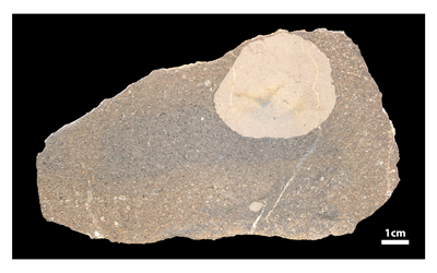 Figure 5: rounded mudstone pebble (intraclast) floating in a bioclastic grainy matrix at level 194.5.