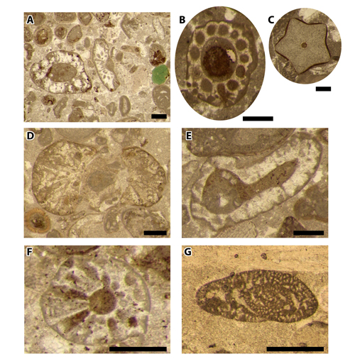 Figure 6: A: slightly glauconitic oobioclastic wackestone with the algae Salpingoporella genevensis (oblique section) and Actinoporella gr. podolica (oblique section) - Sample 26.5m; B: subtransverse section of a charophyte stem - Sample 218.1m; C: transverse section of a crinoid columnal - Sample 218.1m; D: oblique section of the alga Falsolikanella danilovae - Sample 92.3m; E: branching thallus (rare) of the alga Salpingoporella muelhbergii - Sample 92.3m; F: oblique section of the alga Pseudoactinoporella fragilis - Sample 26.5m; G: the benthic foraminifer Choffatella decipiens - Sample 49.8m. Scale bar = 500µm.