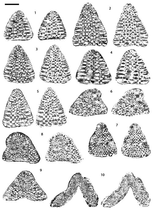 In order to test the validity of existing scales ( et al., 2002; et al., 2005; et al., 2007, 2010a), we needed a reference framework. We selected the "distribution chart of Orbitolinids" given by et al. (2005) because with almost 50 taxa it was intended to give the most comprehensive list of species. However, to make this chart easier to read we introduced some but few simplifications. For instance, we did not discriminate between the varieties of Urgonina alpillensis, nor between primitive and advanced forms of Orbitolinopsis debelmasi, nor between Dictyorbitolina ? vercorii and Dictyorbitolina aff. vercorii. In addition, Valserina sp. 1 and Valserina broennimanni are treated as V. (gr.) turbinata whereas Praedictyorbitolina carthusiana is included in the group Dictyorbitolina ichnusae-carthusiana. Finally Rectodictyoconus ? cf. giganteus appears as Montseciella alguerensis and Falsurgonina sp. 1 as Falsurgonina vanneauae.