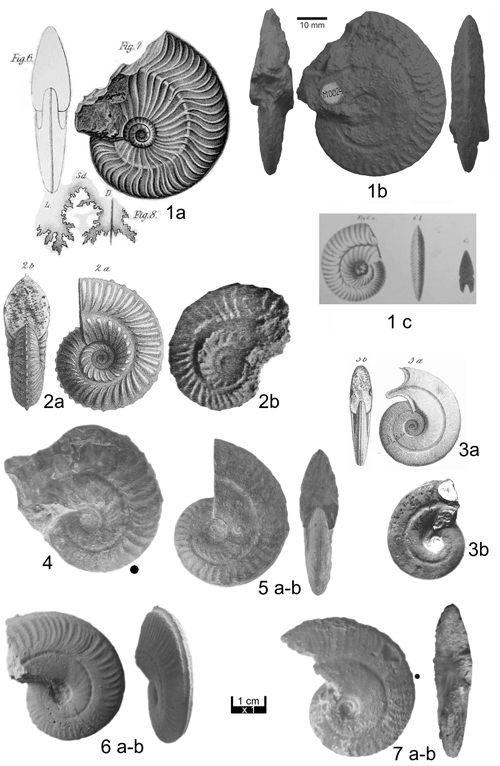 1 - Ammonites canaliculatus Comte de , 1831 : 1a - figuration "originale" in de (1831) ; 1b - photographie du moulage de l'holotype (photographie H. , Rosario, Argentine) (toutes x 0,5) ; 1c – figuration originale in von (1832)