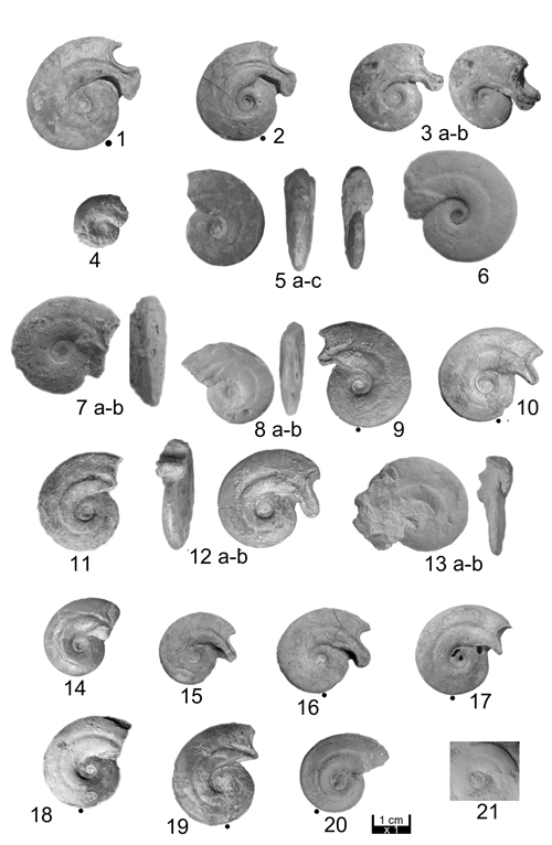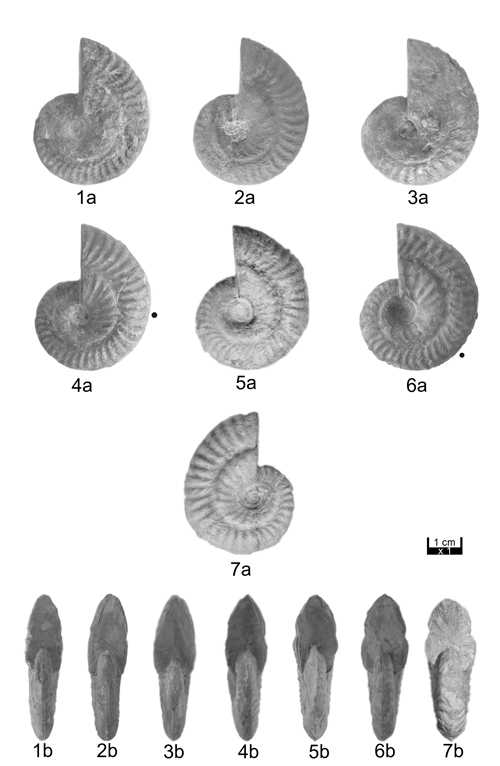 4 à 7 – N. lautlingensis [M] (, 1913) : 4, n° laut-47 (D = 47 mm avant cassure) ; 5 a-b, n° Nc1 (D = 47 mm) ; 6 a-b, n° 947 (D = 45 mm, Pologne, collection IKR ) ; 7 a-b, n° C87038 (D = 59 mm, collection Y. , environs de Notre Dame d'Or, Vienne) - (non indiqués = autres collections)