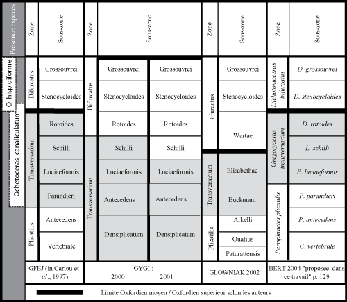 Tableau 1 : Distribution verticale de l'espèce Ochetoceras (Ochetoceras) canaliculatum (de , 1831) et stratigraphie (selon les auteurs, post G.F.E.J., 1997) de l'Oxfordien moyen et supérieur (pars).