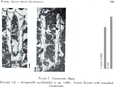 This first report is a revision of fossil calcareous green algae (Dasycladales) described from the Upper Cretaceous and Paleocene series of Guatemala. Among other things in their 1965 paper J.H. and H.V. introduced three new species originally referred to the genera Acroporella, Cylindroporella, and Cymopolia. One species, which has previously been referred to the genus Cylindroporella, is a foraminifer.