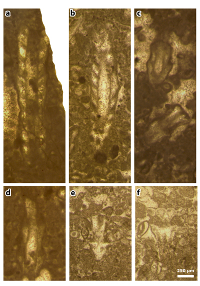 Plate 7: Figures a-f: Cymopolia mayaense & , 1965, thin section 42504. a) oblique section; b) subaxial section; c) oblique section; d) axial section; e) oblique section; f) oblique section.