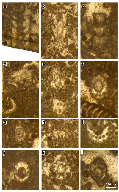 Plate 2: Figures a-l: Clypeina occidentalis & in et al., 2013 [= Clypeina occidentalis & ex & in et al., 2013, non 1965], thin section 42499. a) axial section; b) the neotype, an oblique section; c) tangential section; d) tangential section of two ( ?) laterals (above) and oblique section of a single whorl (below); e) oblique (above) and tangential (below) sections; f) oblique section (with Pseudorhapydionina moulladei , 1995); g) subtransverse section; h) oblique section of a single whorl; i) oblique section; j) subtransverse section; k) subtransverse section; l) subtransverse section.