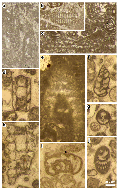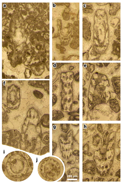 Figures d & f-i: thin section 42504. d) Clypeina occidentalis & in et al., 2013 [= Clypeina occidentalis & ex & in et al., 2013, non 1965], axial section; f) indetermined foraminifer (Valvulinid); g) Pseudorhapydionina moulladei , 1995, transverse section; h) Jodotella sp., axial section; i) Kayseriella cf. decastroi ; j) Pseudorhapydionina moulladei , 1995, oblique section.
