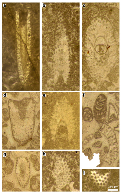Plate 5: Figures a-i: Cymopolia mayaense & , 1965, thin sections 42499 (a-c, e & h-i) and 42504 (d & f-g). a) subaxial section; b) deep tangential section; c) oblique section; d) oblique section; e) oblique section; f) partial oblique section, with Pseudorhapydionina moulladei , 1995; g) oblique section; h) tangential section; i) tangential section.
