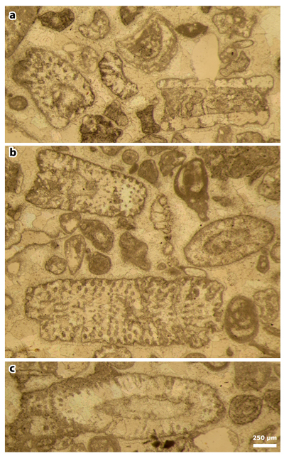 ). There are no bioclasts referable to algae in this slide. We examined it and were able to capture a new image