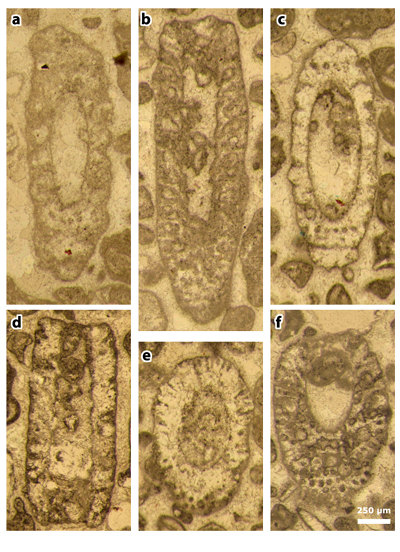 Figure e: thin section 42499. Cymopolia mayaense & , 1965, oblique section.