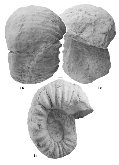 Figure 1: Megatyloceras casei , 1949, lateral (1a), ventral (1b) and frontal (1c) views of the holotype, specimen UMMP 21865. Scale bar is 10 mm.