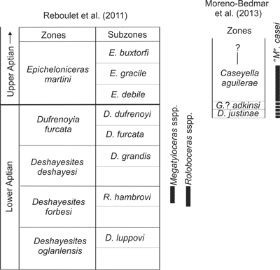 Figure 2: Tethyan lower Aptian and lowermost upper Aptian standard ammonite zonation of et al. (2011) with the ranges of the species of Megatyloceras and Roloboceras, and Mexican uppermost lower Aptian and lowermost upper Aptian ammonite zonation of et al. (2013) with the range of Megatyloceras casei.