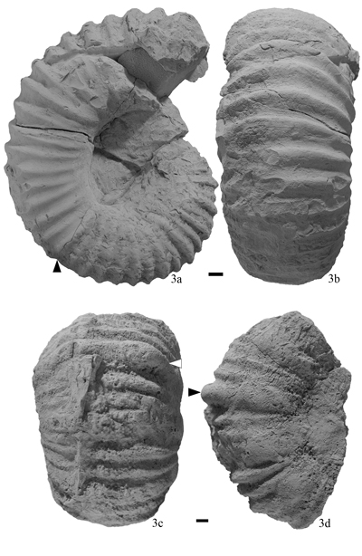 Figure 3: a-b) Cheloniceras sp. of 210 mm of maximum diameter lateral (3a) and ventral (3b) views of the specimen UMMP 16414. Black triangle indicates the end of the phragmocone. El Mulato Ranch, Durango State; c-d) Epicheloniceras sp., ventral (3c) and lateral (3d) views of the specimen UMMP 23215. White and black triangles indicate the equivalent ventral tubercle, characteristic of this genus. North of Rio Nazas Valley, Durango State. Scale bar is 10 mm.