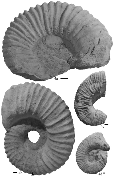 Figure 4: a) Cheloniceras sp. of 175 mm of maximum diameter, lateral view of specimen UMMP 23458. South of Sierra del Rosario, Durango State; b) Cheloniceras sp. of 320 mm of maximum diameter, lateral view of the specimen UMMP 23479. Black triangle indicates the end of the phragmocone. Rio Nazas Valley, Durango State; c) Cheloniceras cf. meyendorffi of 160 mm of maximum diameter, lateral view of specimen UMMP 23485. West side of Sierra del Rosario, Durango State; d) Cheloniceras sp. of 225 mm of maximum diameter, lateral view of specimen UMMP 23480. North of Rio Nazas Valley, Durango State. Scale bar is 10 mm.