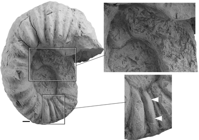 Figure 5: Lateral view of the holotype of Megatyloceras casei , 1949, UMMP 21865 with two enlargements. The two white triangles show two very rudimentary tubercles. Scale bar is 10 mm.