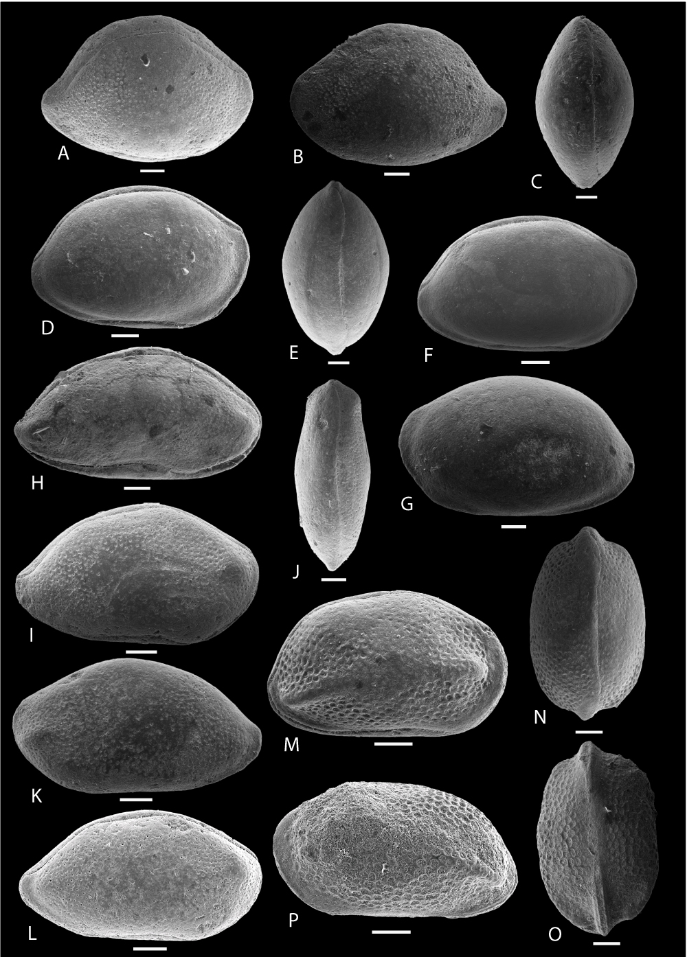M-P: Triebelina obliquocostata , & sp. nov. M-O: holotype, C, ULVG- ULVG-9869, sample 74.40 m, L: 0.651, H: 0.378, W: 0.411, M: right view, N: DV, O: VV; P: paratype, C, left view, ULVG-9870, sample 74.40 m; L: 0.704, H: 0.400, W: 0.432.