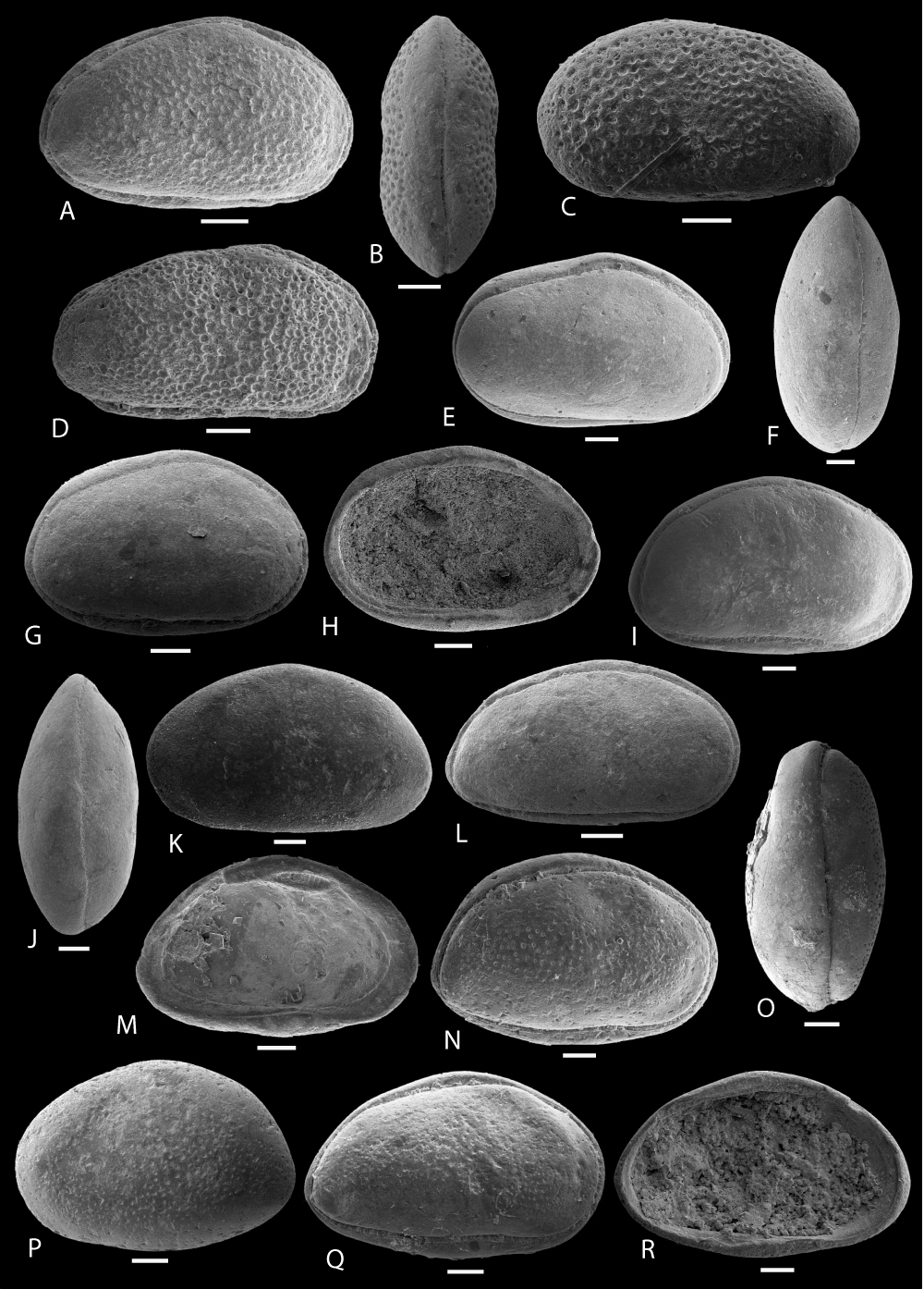 N-R: Ovocytheridea triangularis , & sp. nov. N: holotype, C, right view, f, ULVG-10112, sample 27.90 m, L: 0.880, H: 0.600, W: 0.440; O: paratype 1, C, DV, f, ULVG-10119, sample 28.30 m, L: 0.800, H: 0.540, W: 0.440; P: paratype 2, C, left view, f, ULVG-10090, sample 27.60 m, L: 0.840, H: 0.600, W: 0.460; Q: paratype 3, C, right view, m, ULVG-10075, sample 26.70 m, L: 0.900, H: 0.480, W: 0.380, R: paratype 4, LV, IV, ULVG-10149, sample 30.20 m, L: 0.890, H: 0.560.