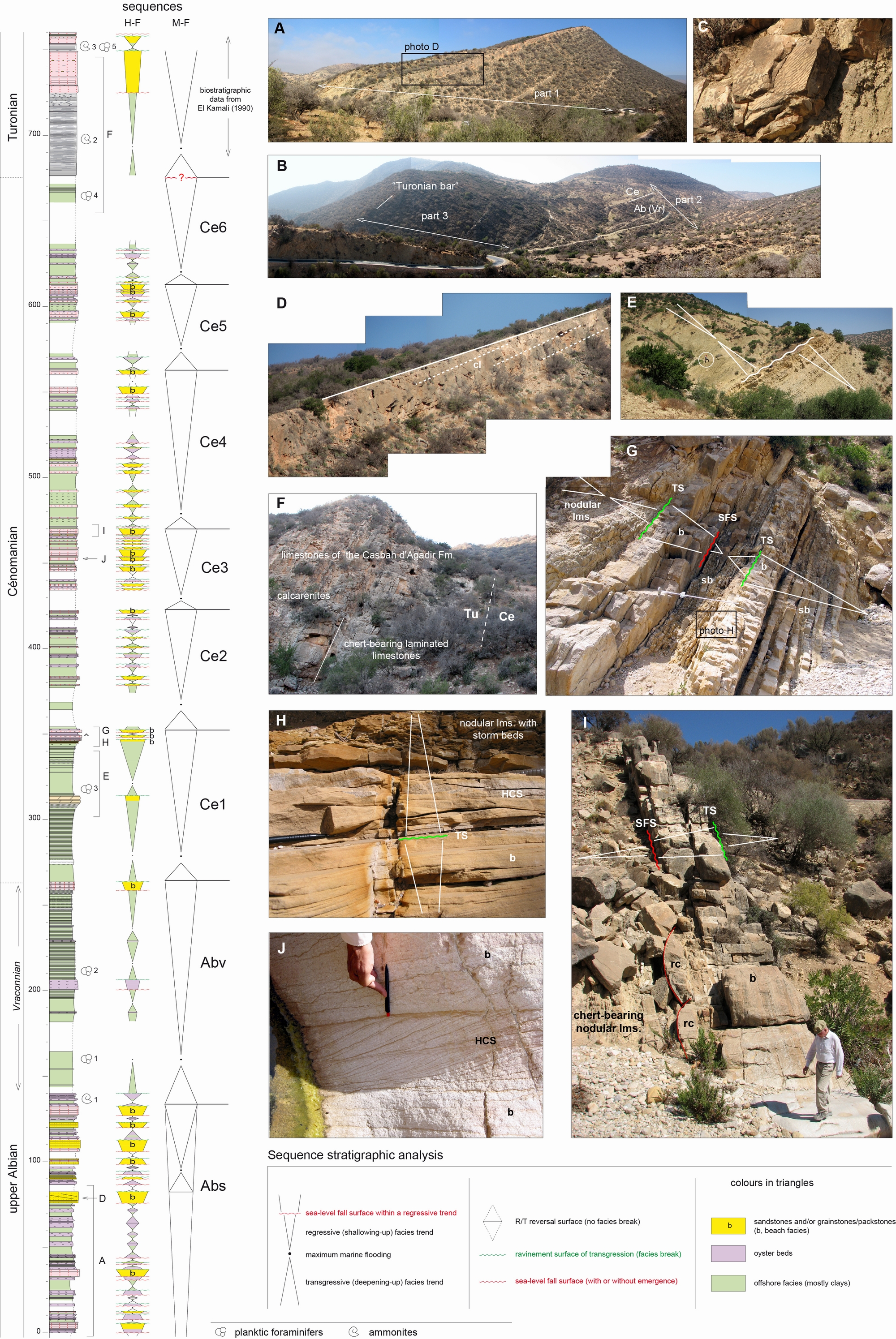 Figure 5: Tahanoute section. A, view of the lower part of the section; B, View of the mid and upper parts of the section; C, Wave rippled surfaces within a tide-influenced beach facies; D, dipping surfaces within a beach wedge; E, view of lowermost Cenomanian, marl-dominated sequences (M-F sequence Ce1) (people, circled, for scale); F, view of the Cenomanian-Turonian transition; G, view of the package of H-F sequences at top of a medium-frequency sequence Ce1; H; transition from the evenly-laminated beach facies and the transgressive, HCS-bearing deposits; I; view of a typical H-F sequence showing the beach facies sharply resting on offshore nodular limestones; J, view of a beach facies bearing HCS sandwiched within the even lamination. Abreviations as on Fig. 3; Ab, Albian, Ce, Cenomanian, Tu, Turonian; Vr, Vraconnian; b, beach facies; HCS, hummocky-cross-stratification; oy, oysters; rc, rip current channel; sb, storm beds.
